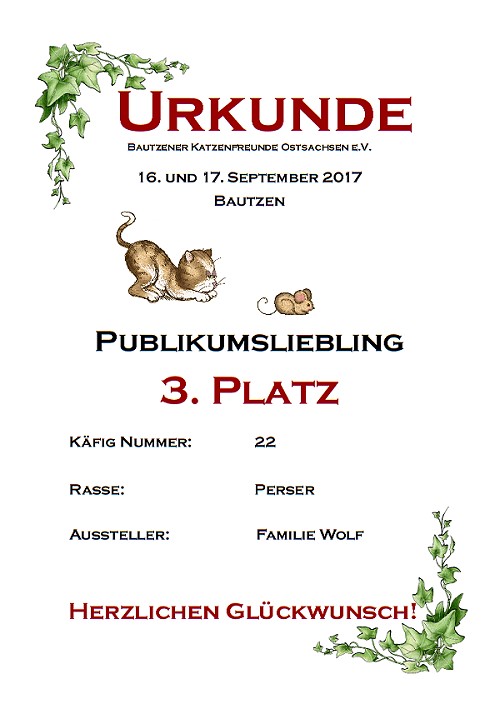 Unser Neuzugang Odessa war das erste Mal mit uns zur Ausstellung. Und gleich bekam sie den 3. Platz unter den Publikumslieblingen. Wir freuen uns sehr und sind ganz stolz. | ||